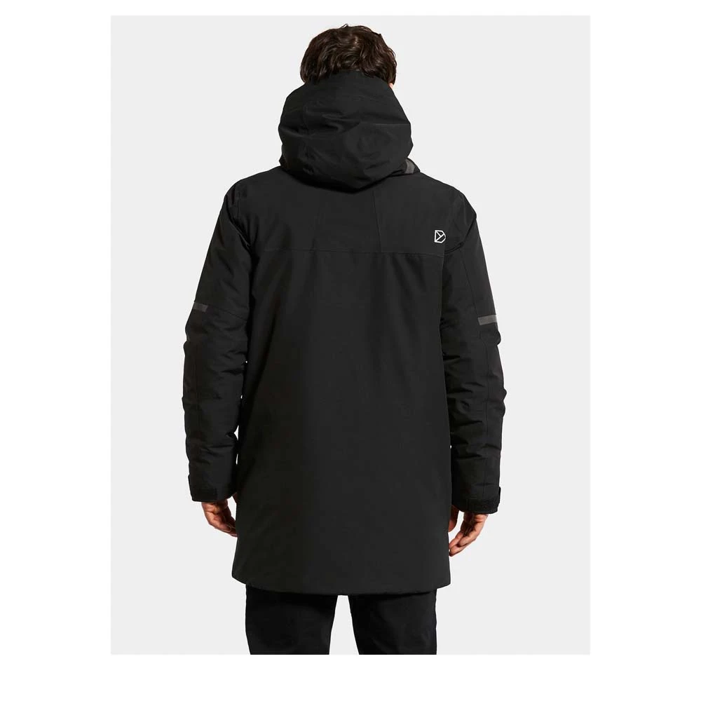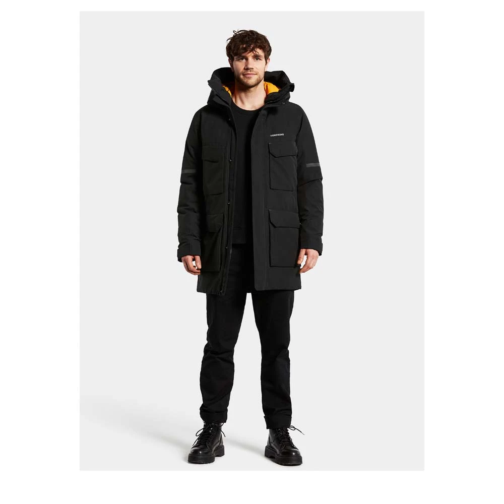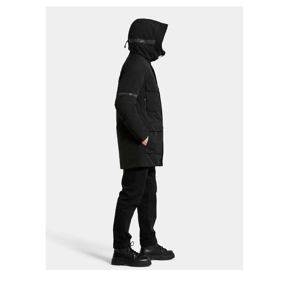 In zwei Reißverschlusstaschen und vier geknöpften Taschen, einer Innentasche mit Reißverschluss hinter der Windschutzleiste und einer Mesh-Innentasche, finden diverse Utilities wie Geldbeutel, Schlüssel, Taschenmesser und Handy Platz. Schwarze reflektierende Details an Ärmeln und Kapuze sowie an den Reißverschlusslaschen sorgen für bessere Sichtbarkeit in der Dämmerung, ebenso der Didriksons-Reflektorprint auf Brust und Schulterblatt.