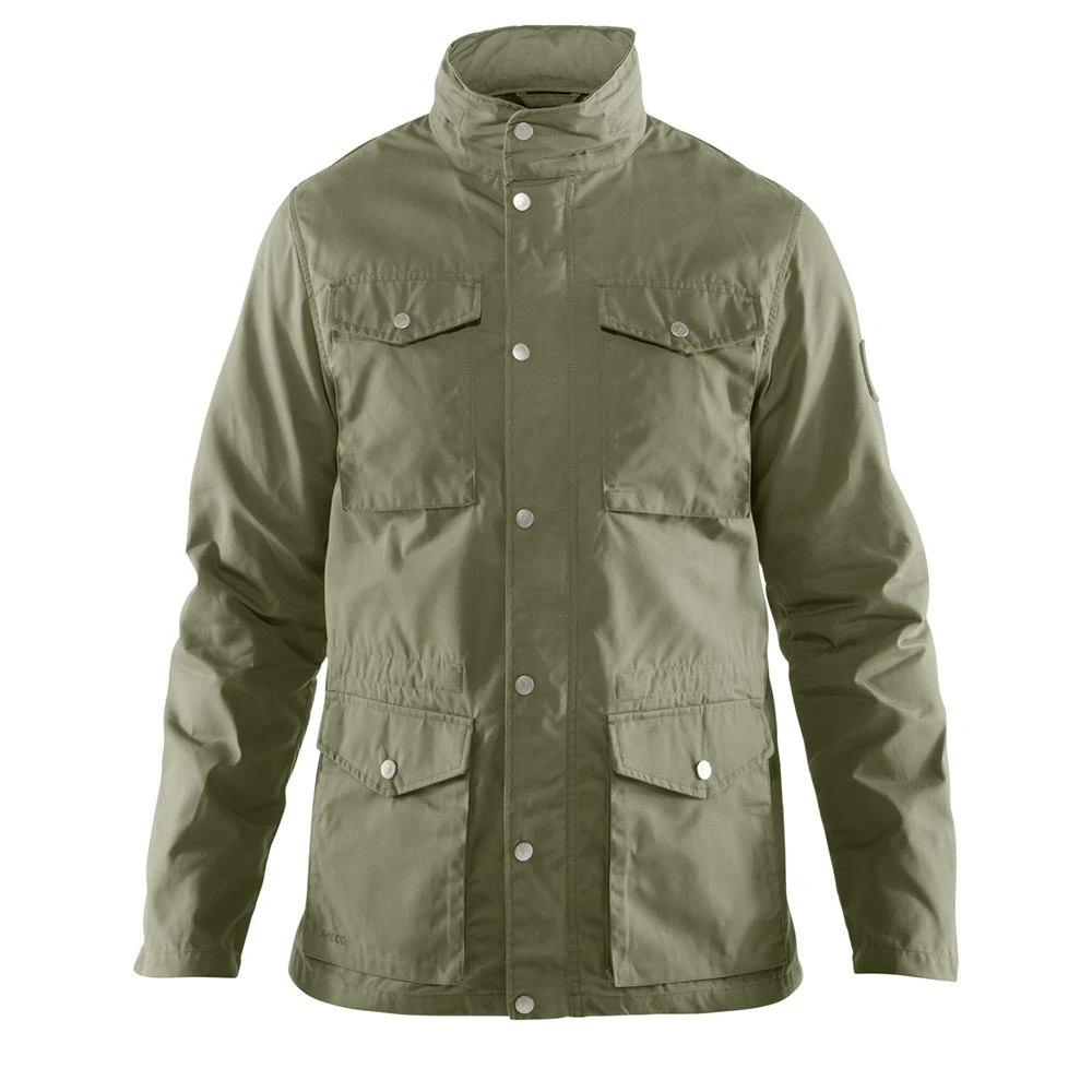 Die Räven Jacket von FJÄLLRÄVEN ist eine klassische Outdoor-Jacke aus G-1000® Eco (recyceltes Polyester und Bio-Baumwolle). Die Kapuze kann bei Nichtgebrauch einfach in den Kragen eingerollt werden. Die vier großen und geräumigen Fronttaschen bieten ausreichend Platz für alles, was unterwegs schnell griffbereit sein muss. Die Jacke ist von Werk aus mit Fjällrävens G-1000 Wax imprägniert. Dadurch ist sie weitestgehend wasser- und winddicht, und eignet sich so besonders für kalte und nasse Regionen. Sollten Sie in wärmeren Regionen unterwegs sein, empfiehlt es sich die Imprägnierung vorher auszuwaschen, um für eine bessere Belüftung und Atmungsaktivität zu sorgen. Die Imprägnierung durch G-1000 Wax kann dann bei Bedarf jederzeit wieder aufgebracht werden. Den G-1000 Greenland Wachs finden Sie auch hier bei uns im Shop!