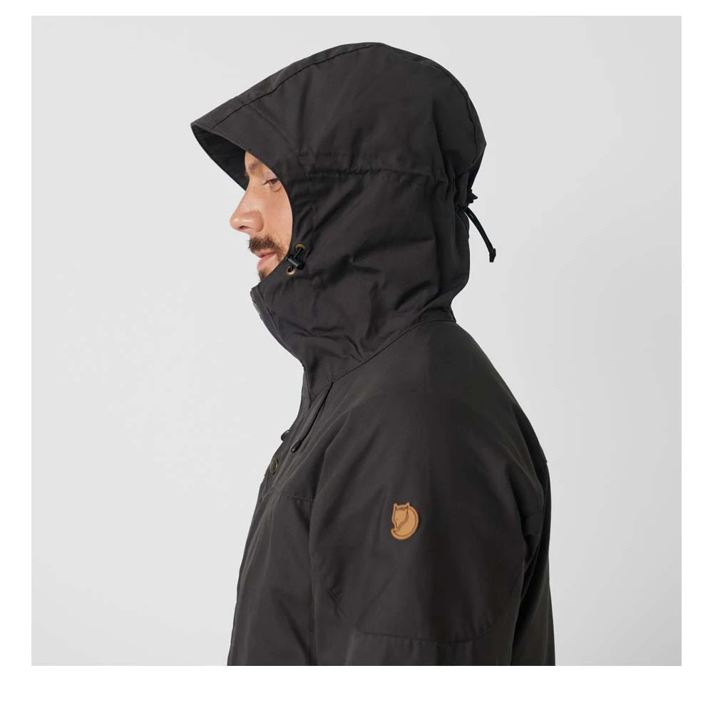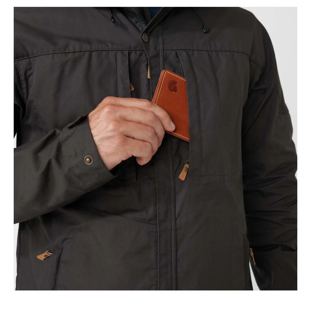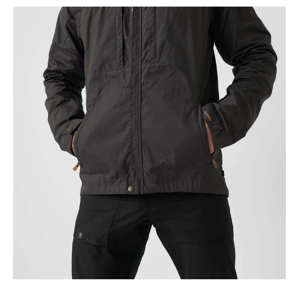 Die Skogsö Jacket von FJÄLLRÄVEN ist eine hüftlange Funktionsjacke aus G-1000® Lite mit tiefem Saum, mit fester, regulierbarer Kapuze und Schulterpartie aus G-1000® Original und einer verlängerten Rückenpartie. Sie schützt vor Wind und leichten Schauern, während das Material gleichzeitig sehr atmungsaktiv ist. Zwei vertikale Brusttaschen und zwei Eingrifftaschen ergänzen das Angebot der Skogsö Jacket.